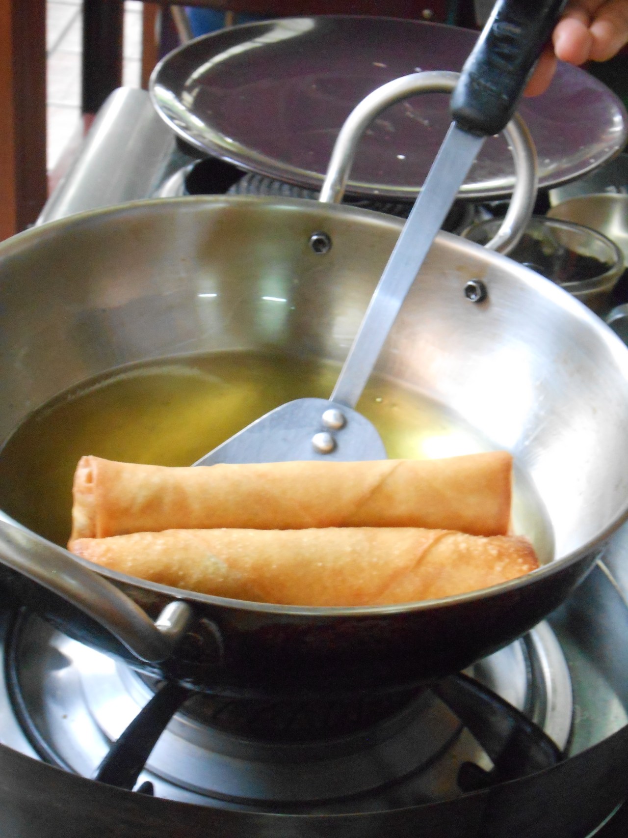 - When frying the spring rolls make sure that the oil is not too hot and keep turning them around with a kitchen tong so they will brown evenly.