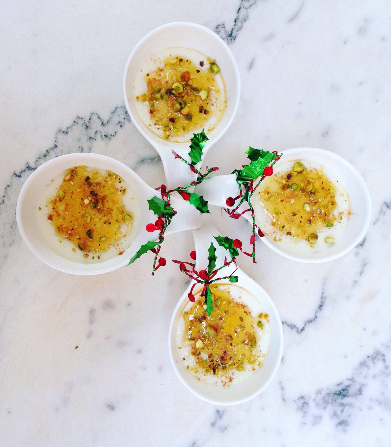 - To serve, pour some honey on each mould and sprinkle each mould with pistachios and cinnamon.