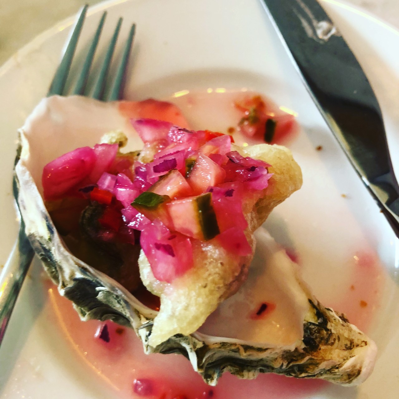 - Put the fried oysters back into their shells and arrange them onto plates.