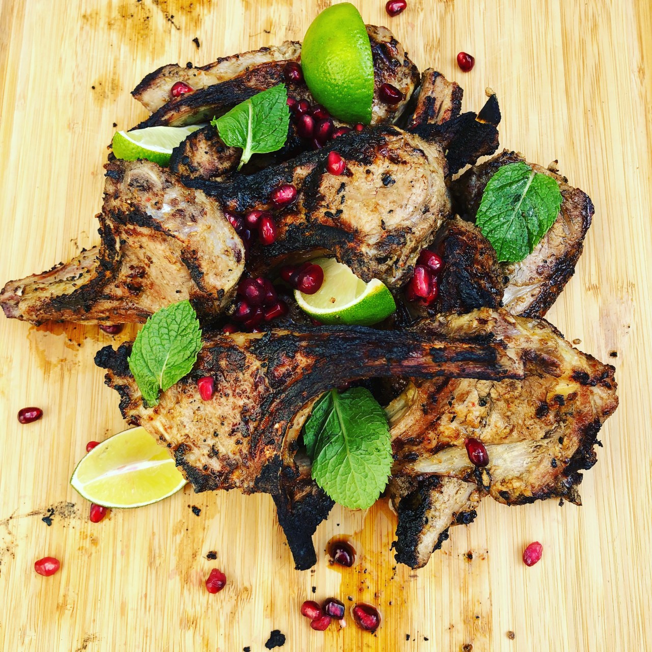 • To serve, arrange the lamb chops on a wooden board sprinkle with pomegranate seeds and decorate with mint leaves and lime wedges.