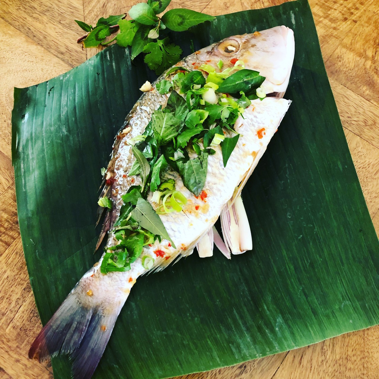 This fish is stuffed with herbs that give it a delicious taste and great aromas. The saltiness comes from the fish sauce and the sourness comes from the lime juice.