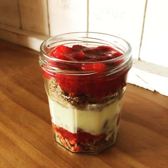 - Divide 1/2 of the biscuits between 4 or 6 glasses or jars. Top with half of the rhubarb compote and press down with a spoon.