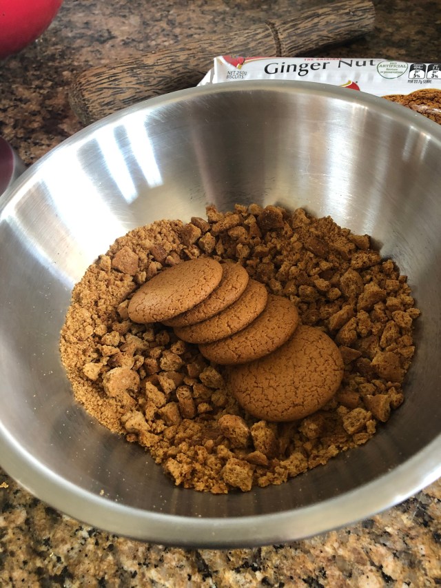 - Meanwhile crush the ginger nut biscuits to coarse crumbs.