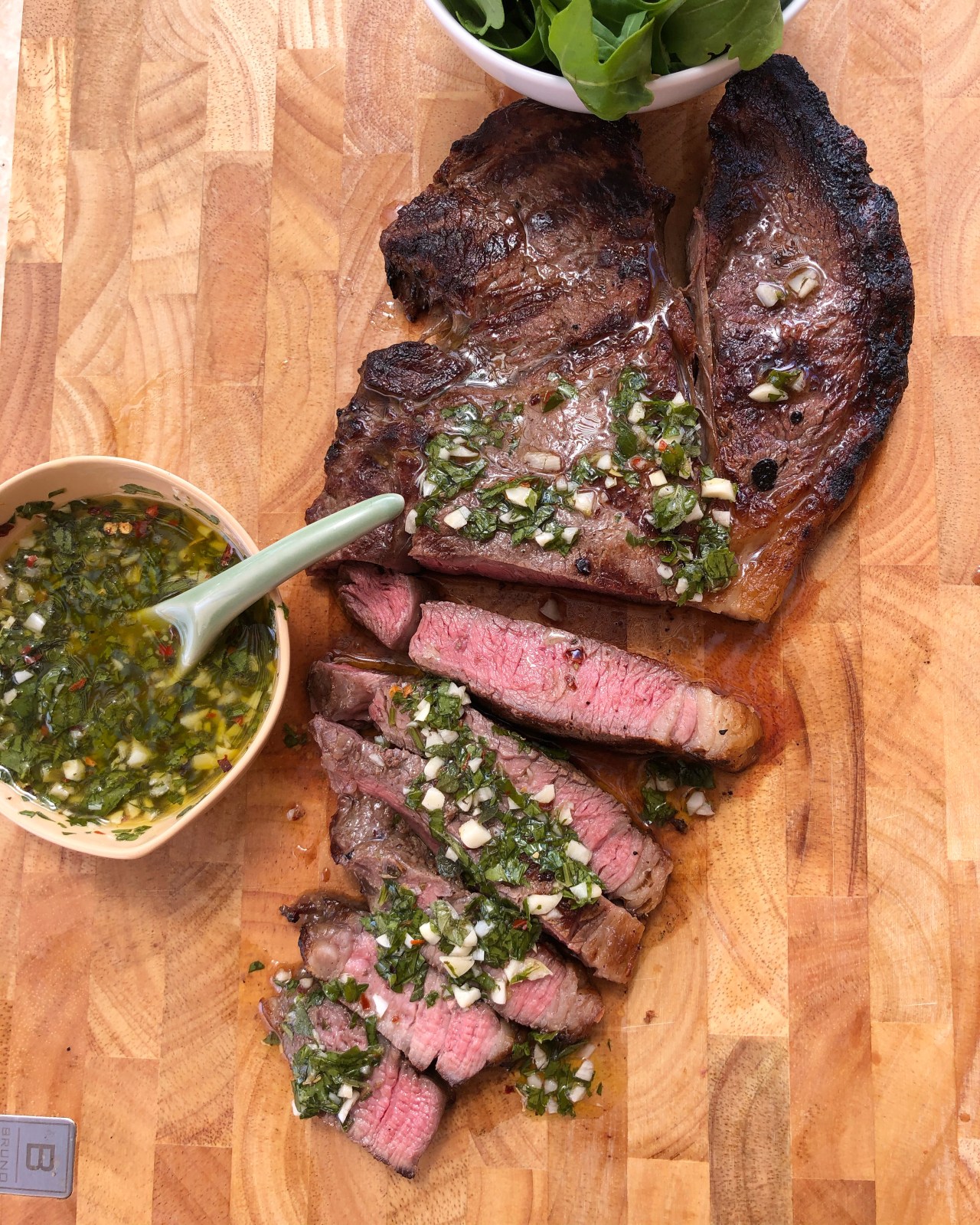• Slice the steaks diagonally and serve the Chimichurri sauce on the side.