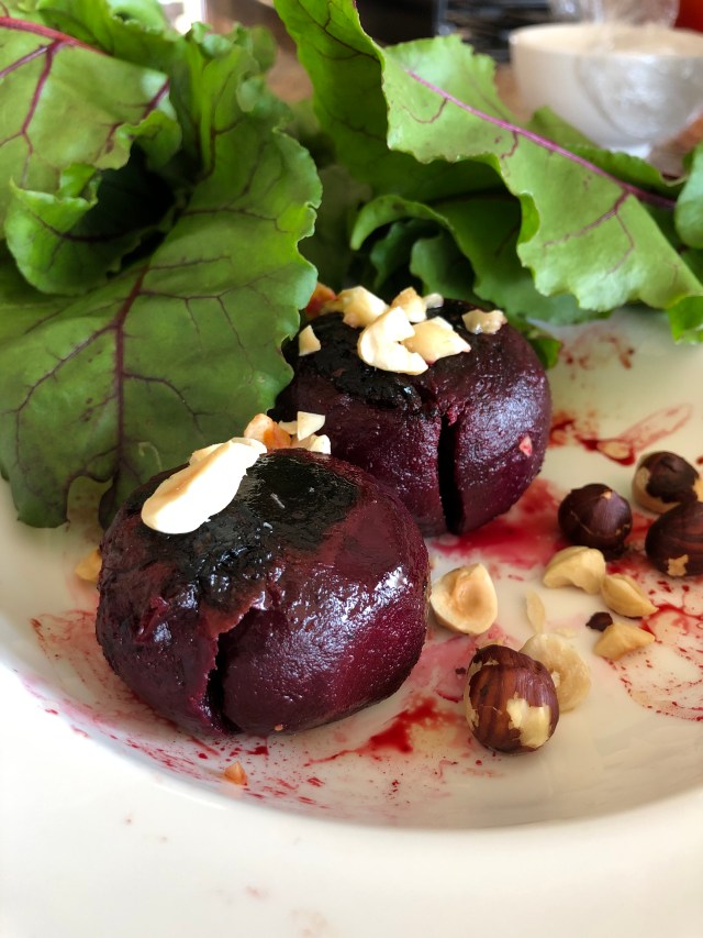 - To serve, toss the young beetroot greens and mixed greens, place a handful of this mixture on each plate.