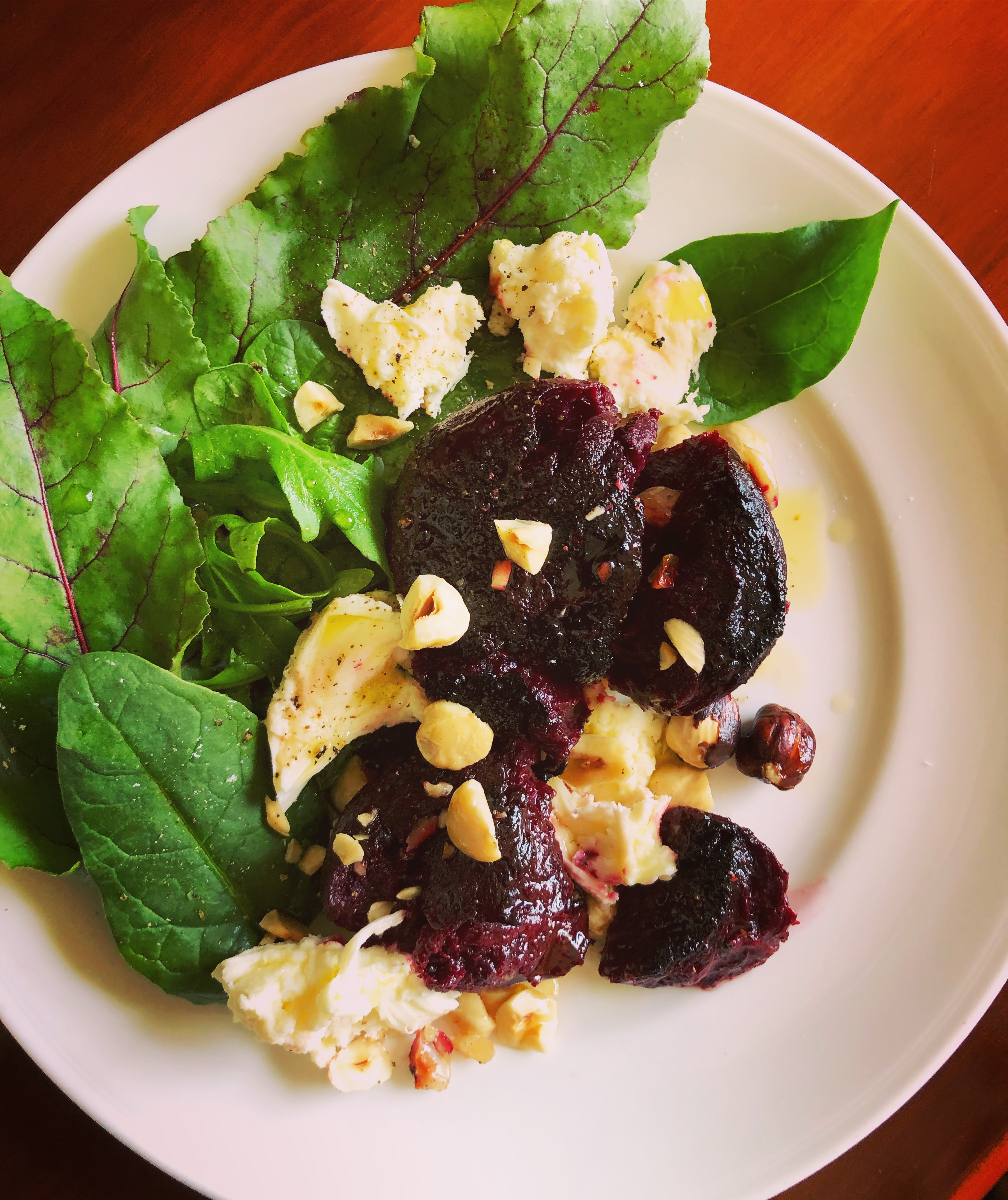 - To serve, toss the young beetroot greens and mixed greens, place a handful of this mixture on each plate.