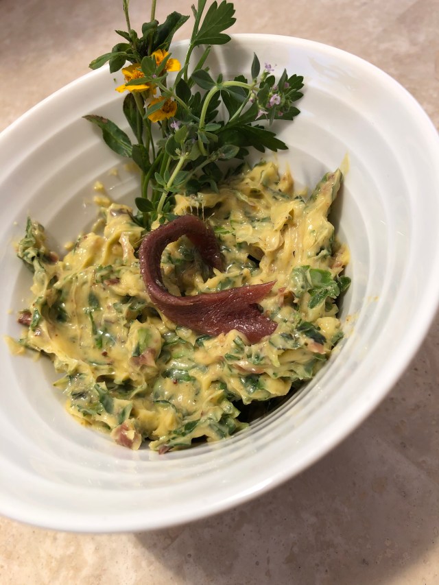 - Whiz anchovy fillets, butter, curry powder, garlic, parsley, tarragon, and thyme in a food processor until well combined. Set aside.
