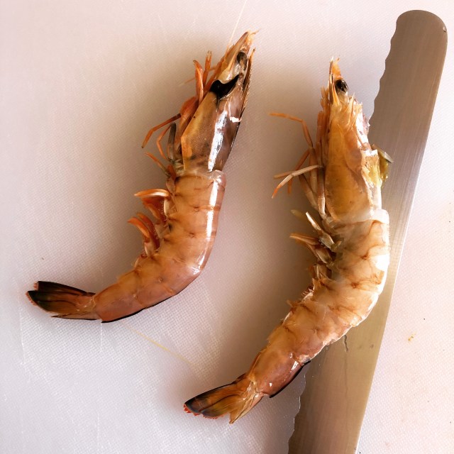 - Using a bread knife cut the prawn’s body lengthways. The bread knife is the best knife to make this job easy.