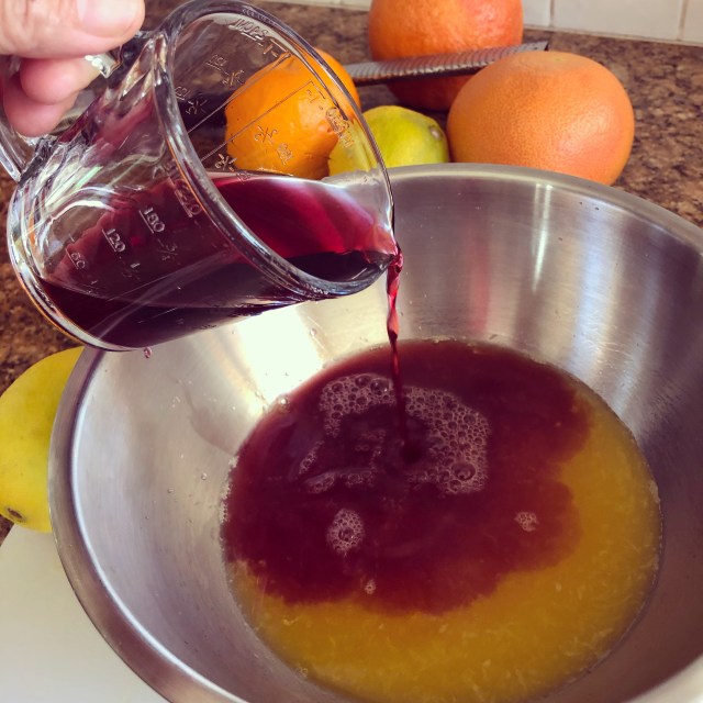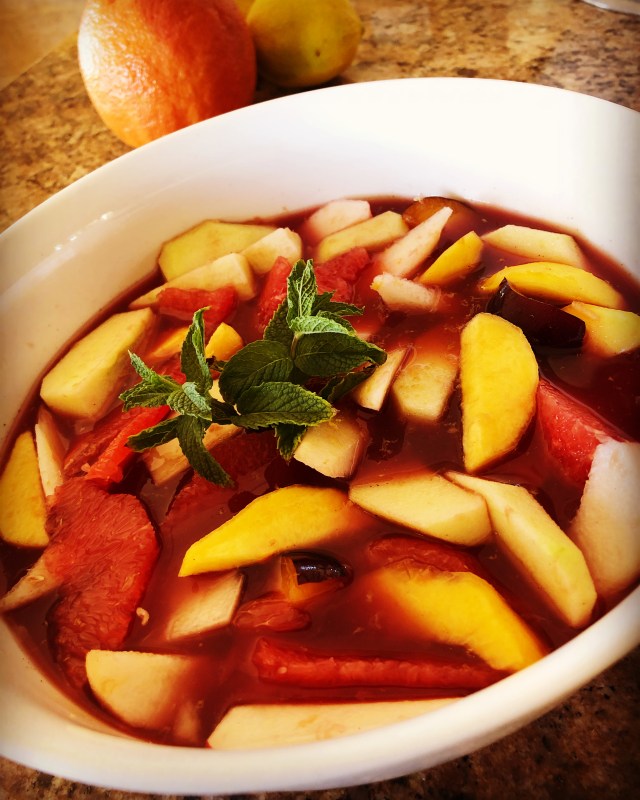 - Add the prepared seasonal fruit to the orange and wine mixture (the Sangria). Mix well with a spoon.