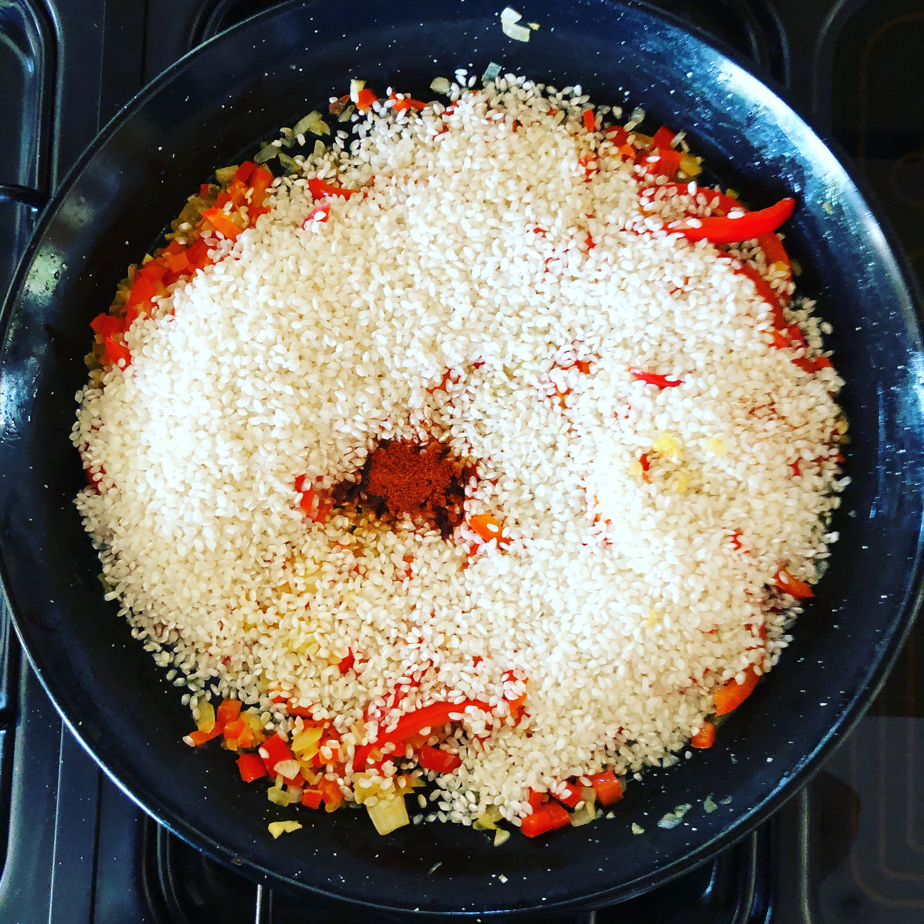- Add the rice and paprika and stir. Add the wine and allow it to evaporate.