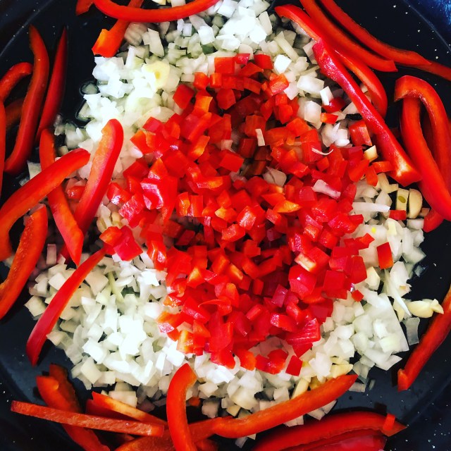 - Place the paella pan on a low flame and add a little olive oil. Add the onions, the garlic, the red capsicums and sauté all these ingredients until they are soft.