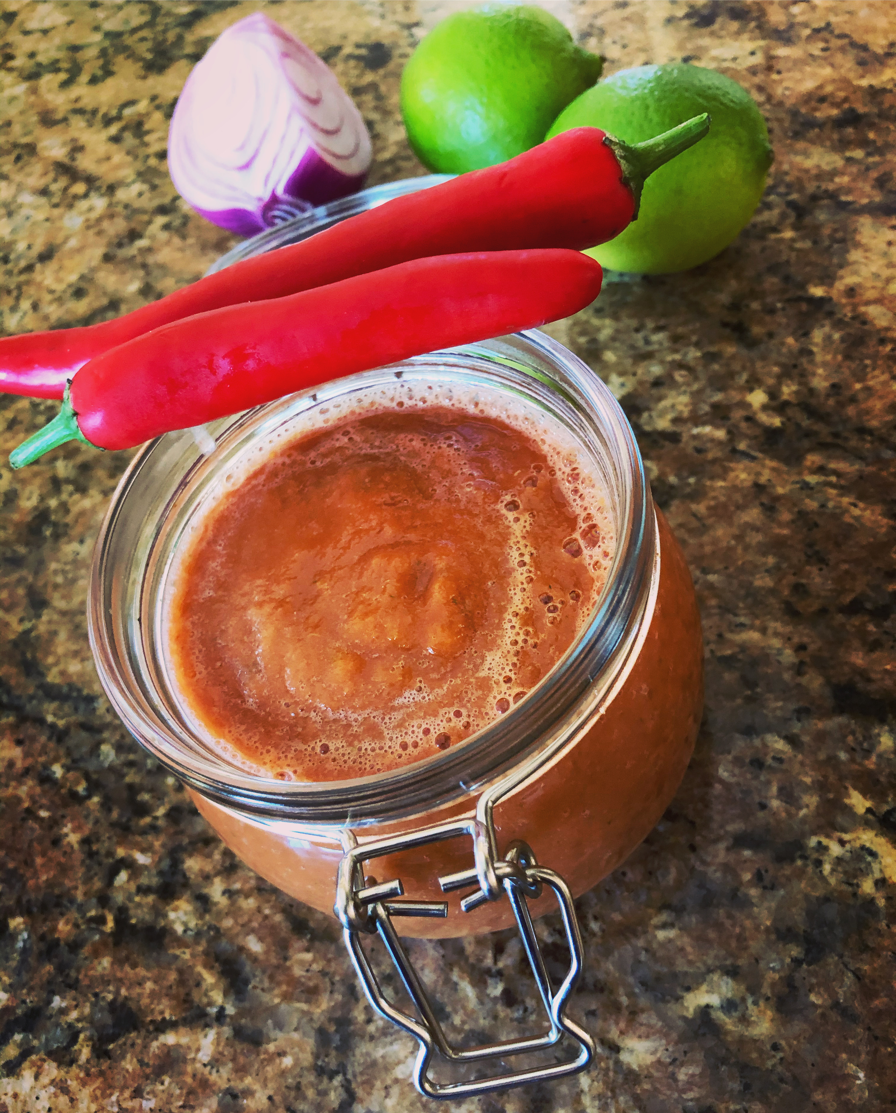 - In a blender or food processor combine the tinned tomatoes, red onion, garlic, jalapeños, parsley (coriander), cumin, sugar, salt and lime juice.