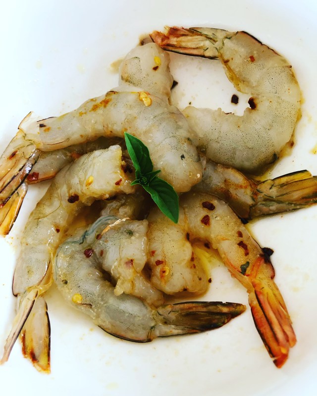 - Toss the raw tiger prawns with the chrushed garlic, chilli flakes, olive oil and salt.