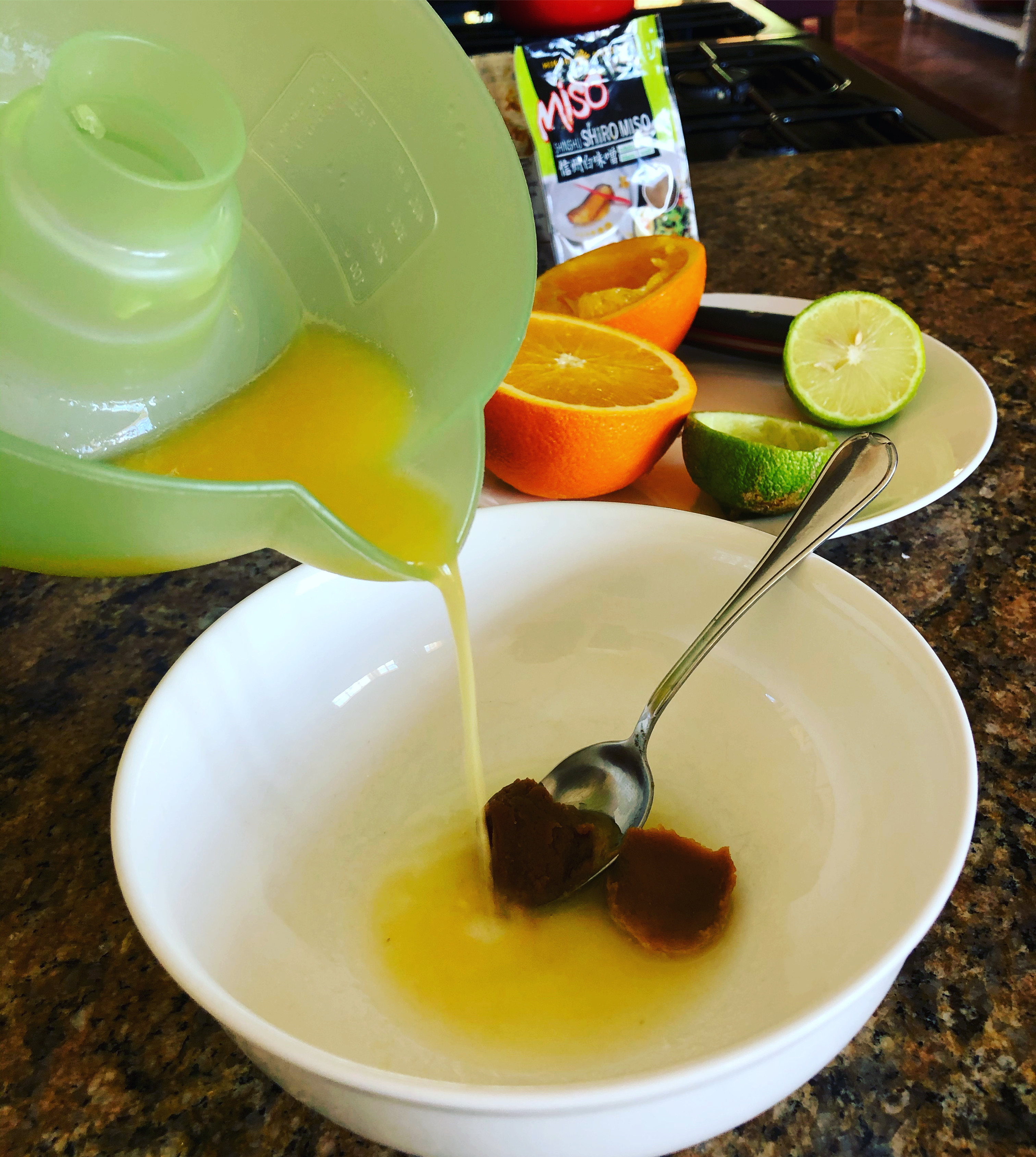 - Place the orange juice, the lime juice, the sesame oil and the Shiro Miso in a small bowl. Using a whisk mix all the ingredients well. Add a bit of salt if necessary.