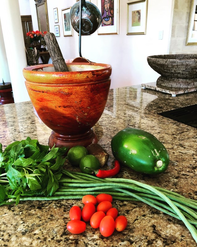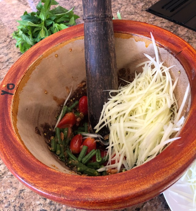 - If you do not have a wooden mortar and pestle you can still make this delicious salad. Mix all the ingredients together with a spoon in a bowl, but you must pound the garlic and chilli in a stone mortar.