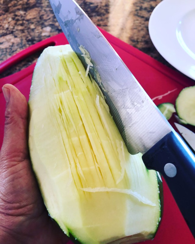 Julienne the Thai way is usually done by peeling the fruit and then using a sharp knife to chop into its flesh many many times to create parallel grooves. The use of the knife in this way for me is very difficult since in Asia in general the way they use the knife is very different to the way I was taught. Luckily I found a small gadget that almost does the same job!.
