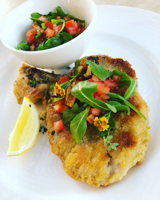 - Serve the pork chops on serving plates and top them with the arugula mixture, then spoon the diced tomatoes on top, season them with salt and pepper and drizzle a bit of extra virgin olive oil.