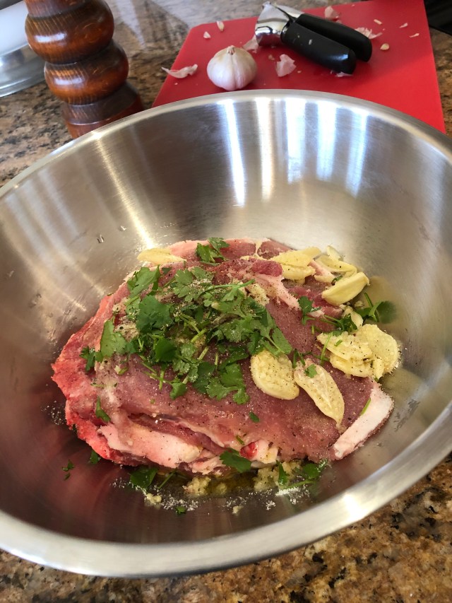- Marinate the pork chops overnight in olive oil, salt and half of the minced garlic.
