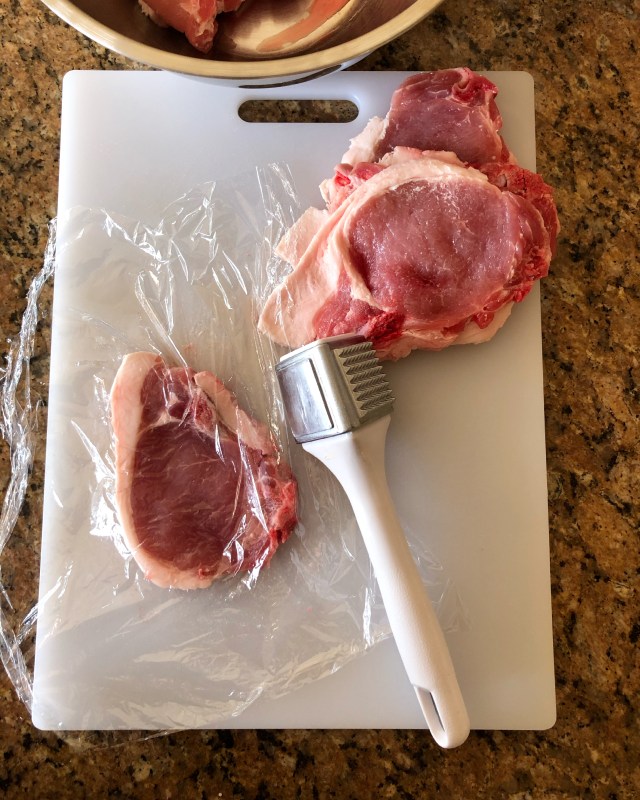 - Place each pork chop on a cutting board and cover it with cling film. Do not trim the excess fat yet or remove the bone.