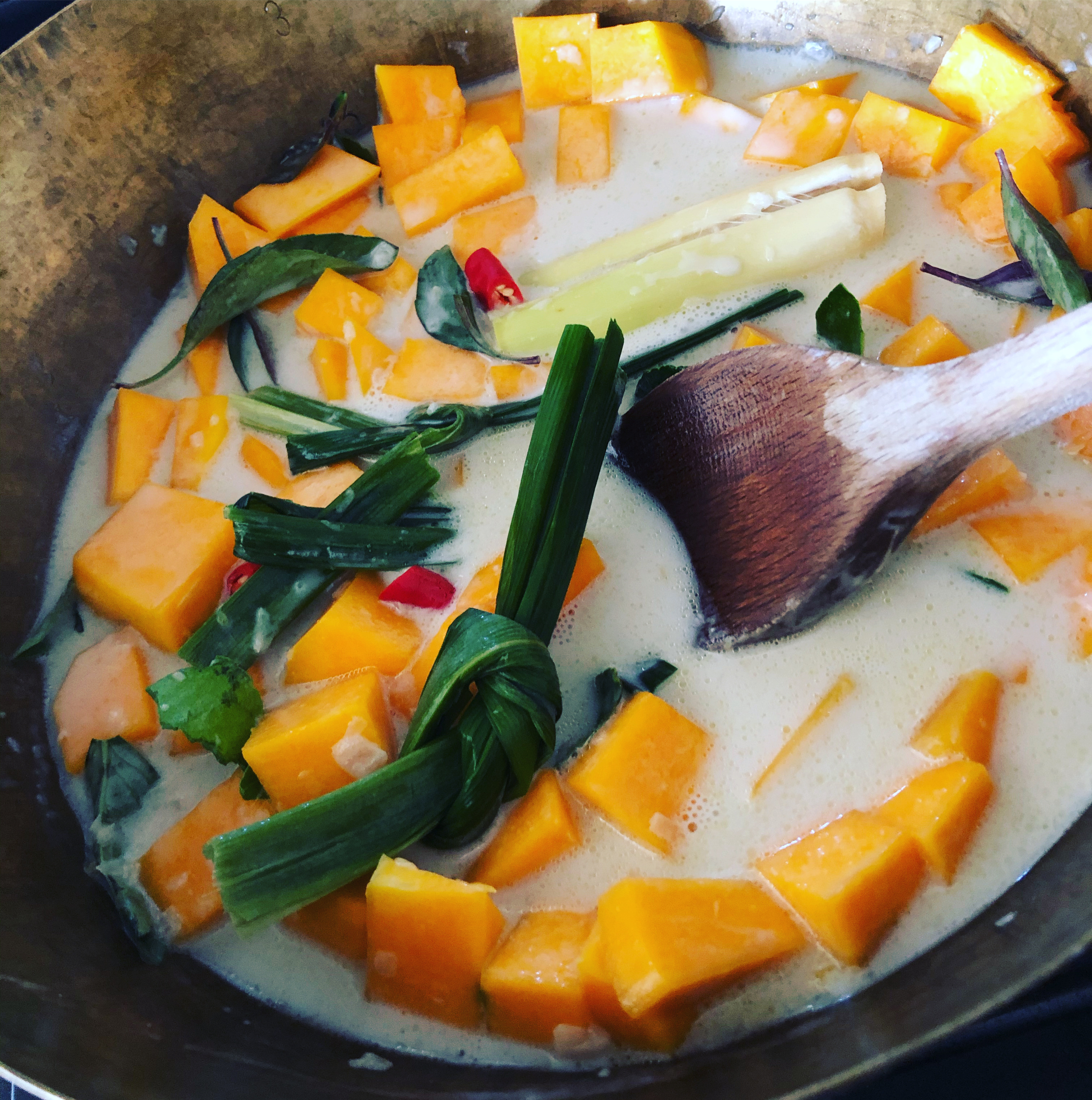- Bring to the boil, reduce the heat and simmer until the pumpkin is almost soft.