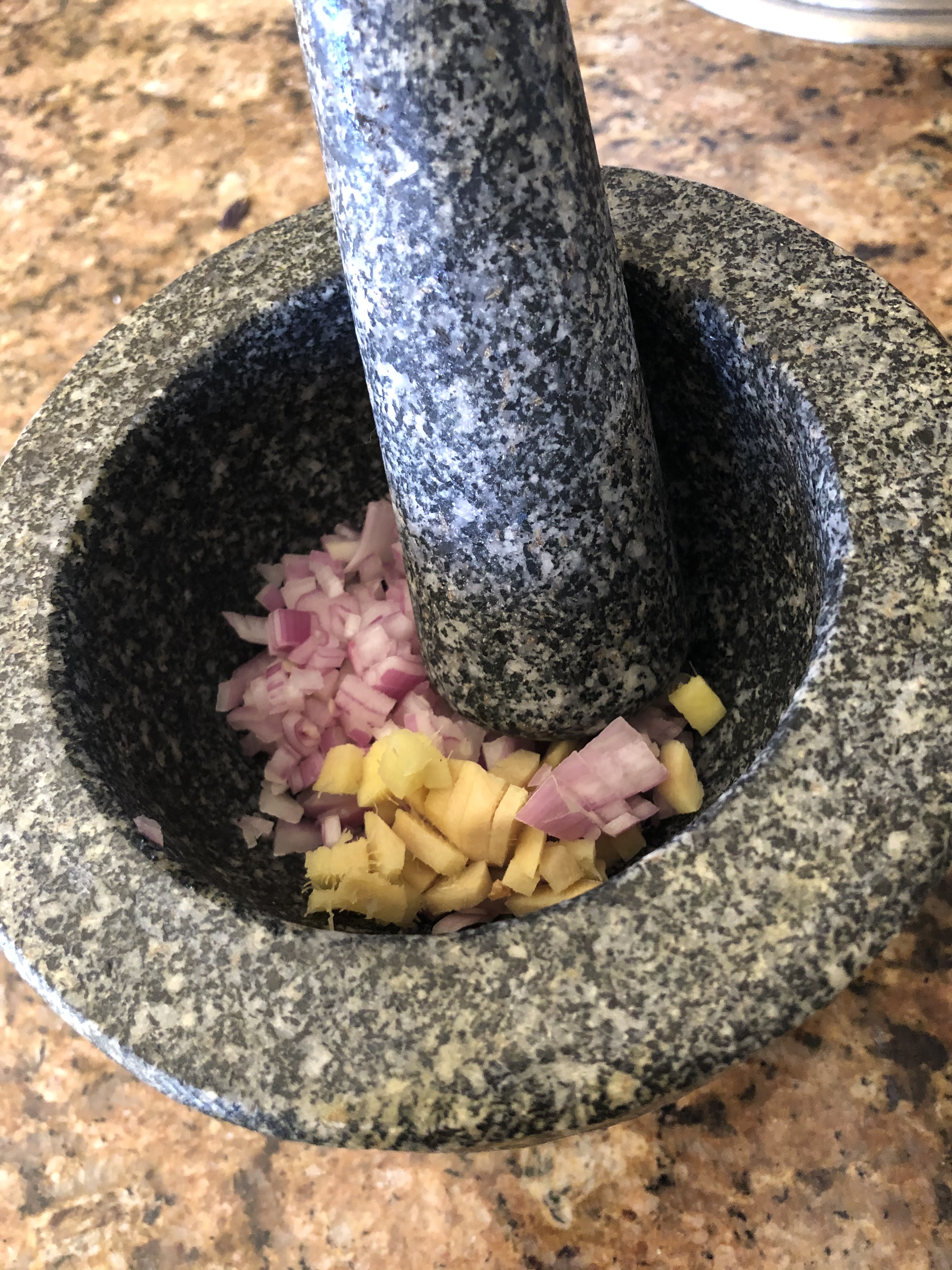 - Combine the shallots and ginger in a stone mortar and grind into a very fine paste.