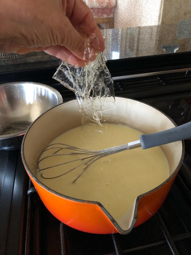 - Weigh the gelatine sheets, for this recipe it has to be 10g exactly. If you change the amount you will end up with a hard Panna Cotta that is not wobbly!