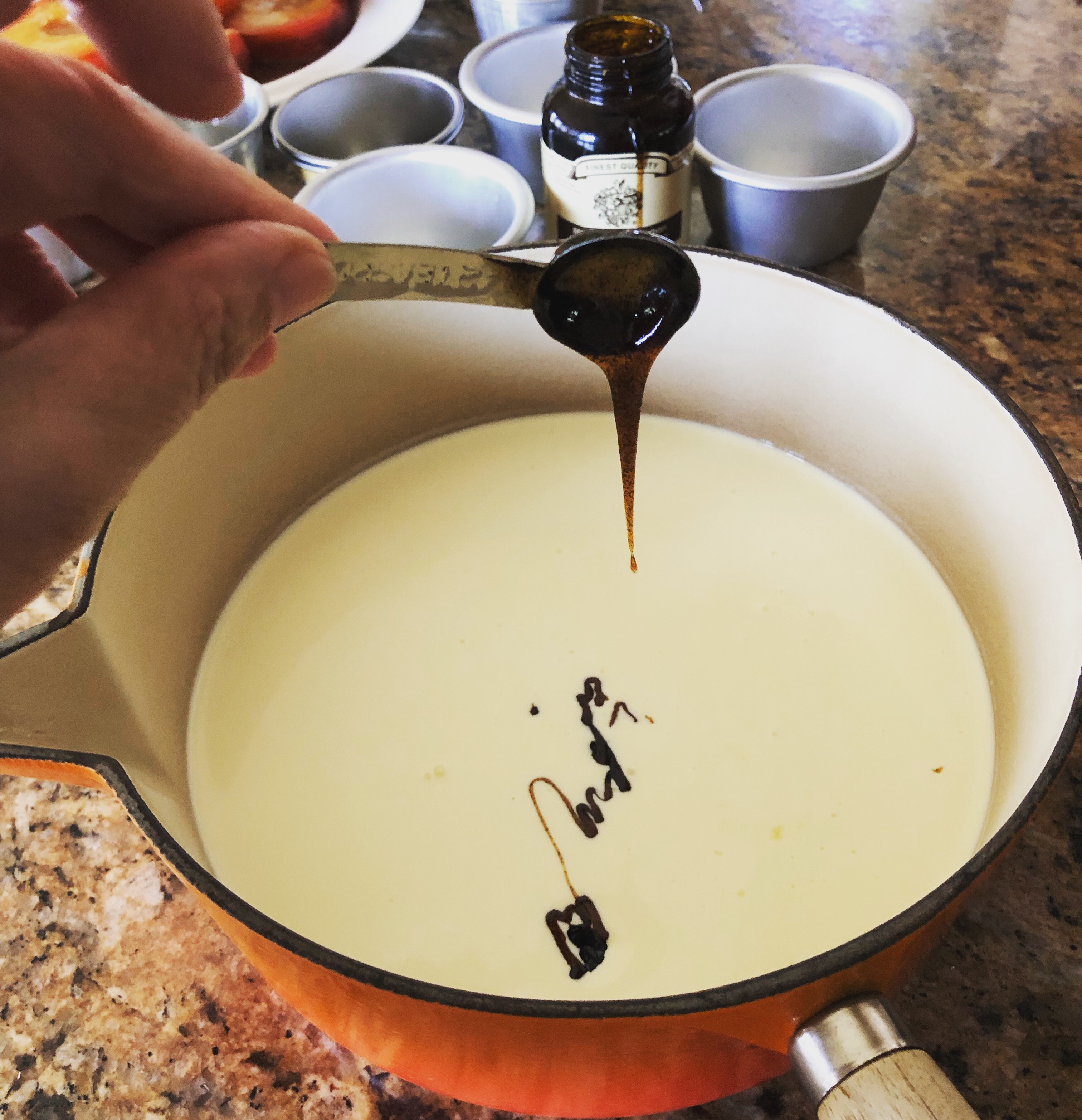 - Pour the milk, cream and vanilla paste into a saucepan with the sugar. Stir to combine and bring to a simmer, then remove from the heat.