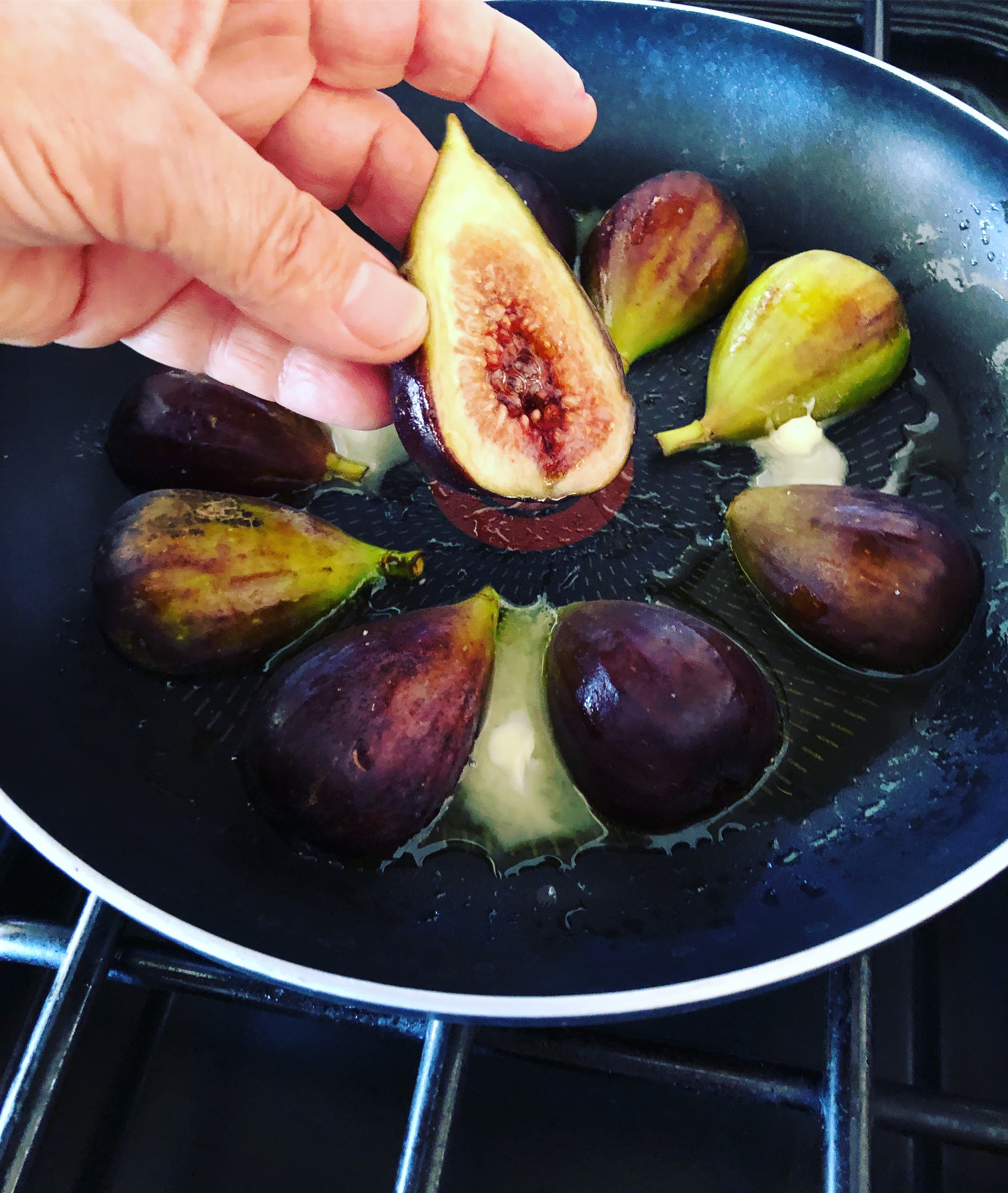 - Cut the figs in half, sprinkle sugar on top and place them cut side down in a buttered pan.