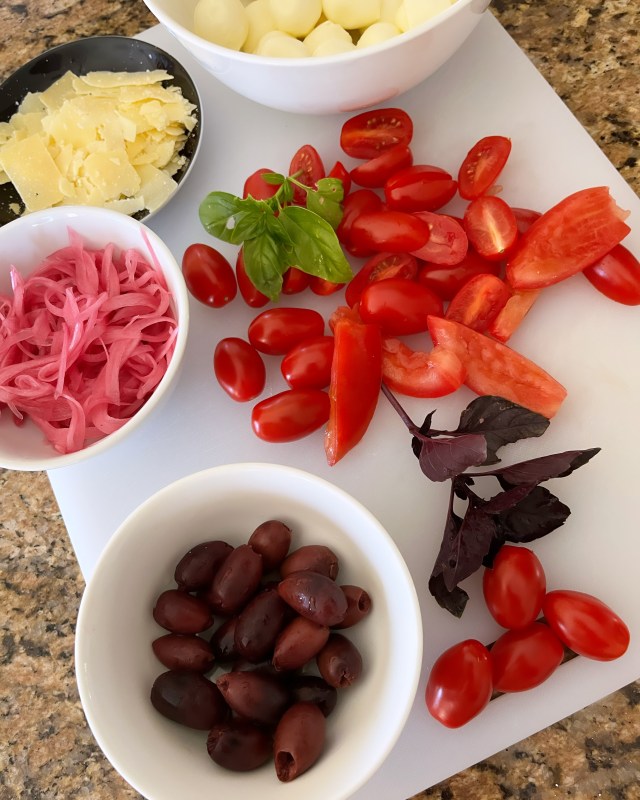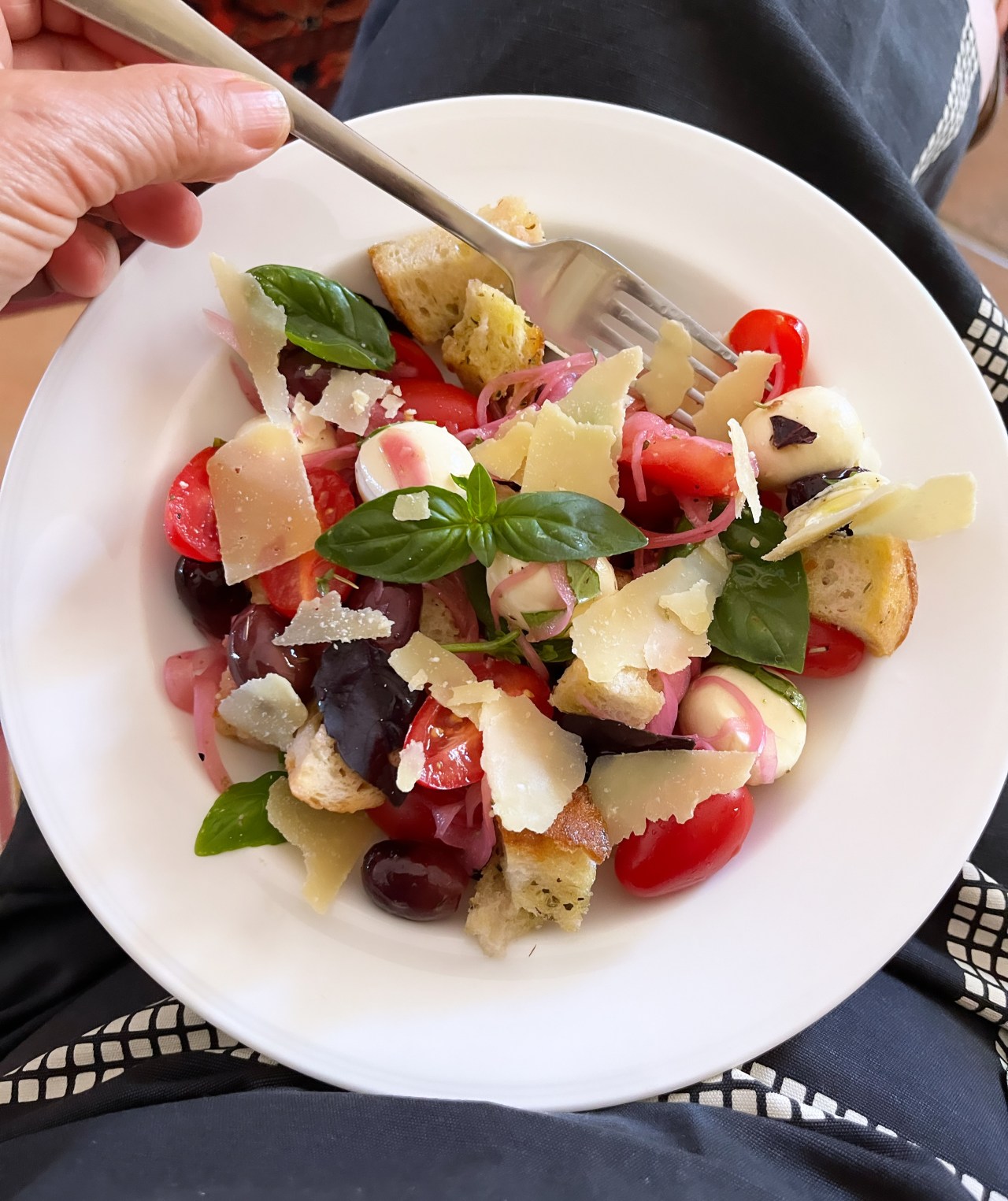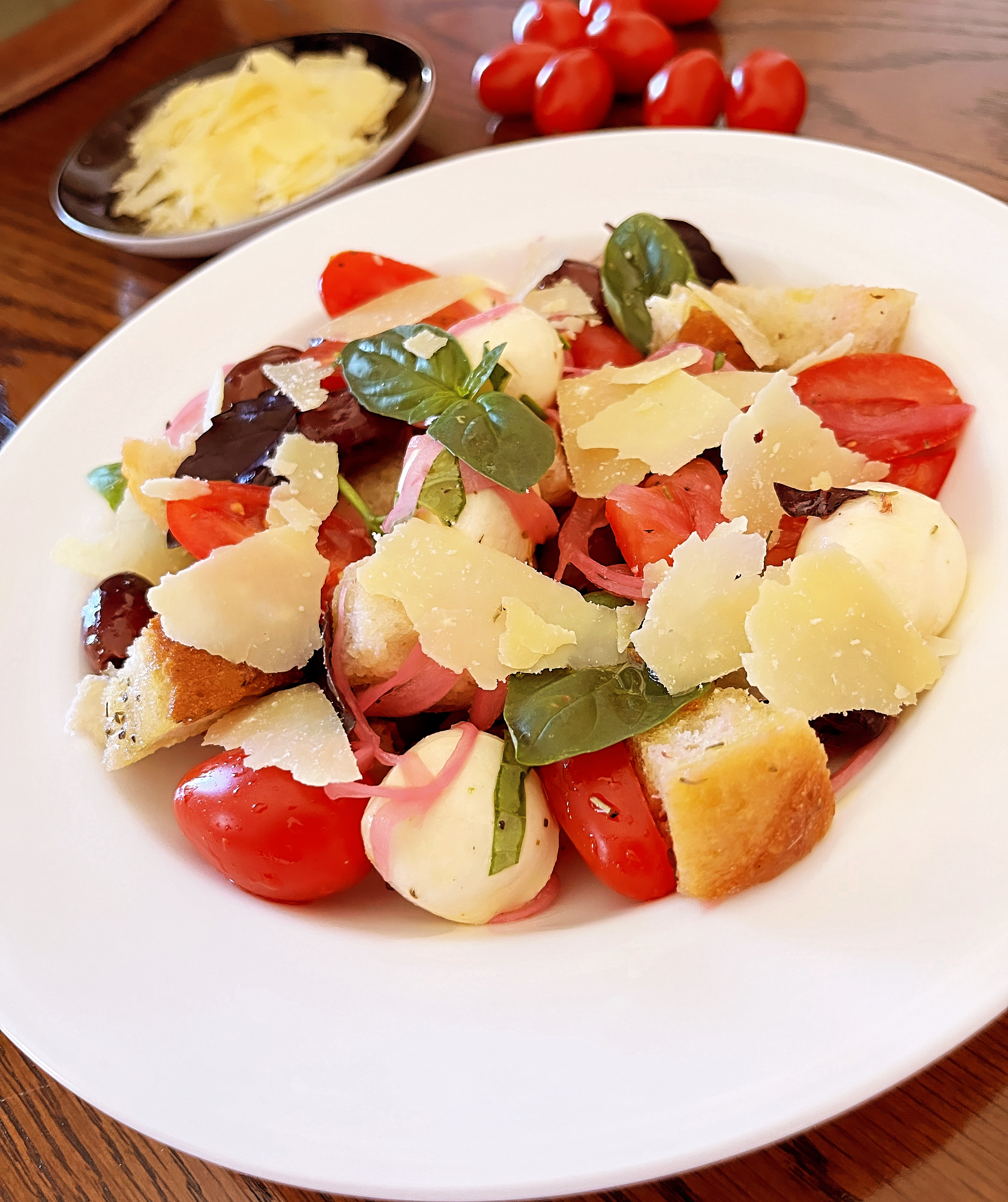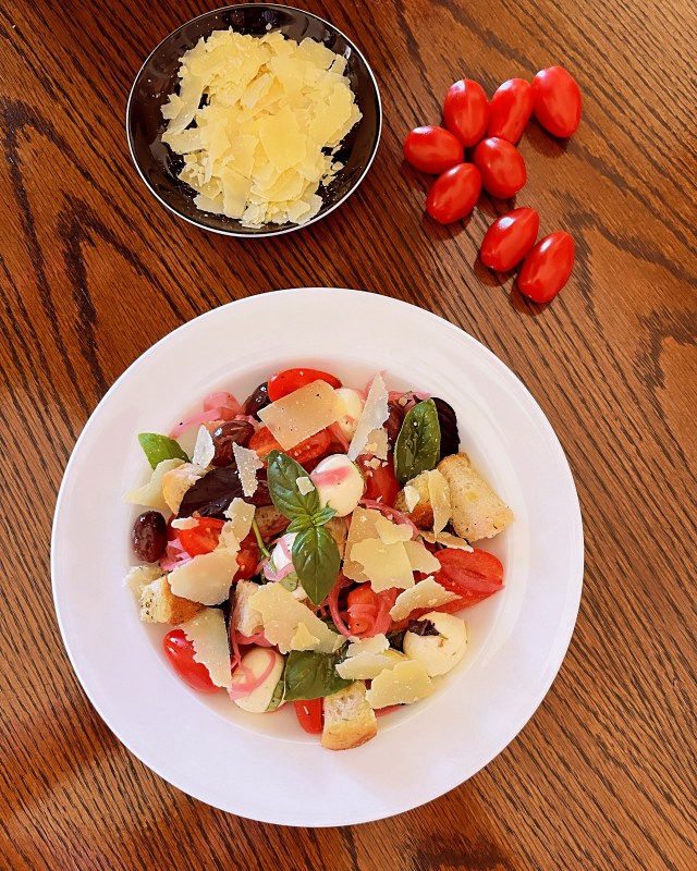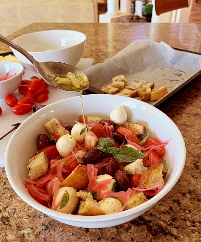 - Put the tomatoes, bread, red onion, olives, basil, salt and pepper in a bowl.