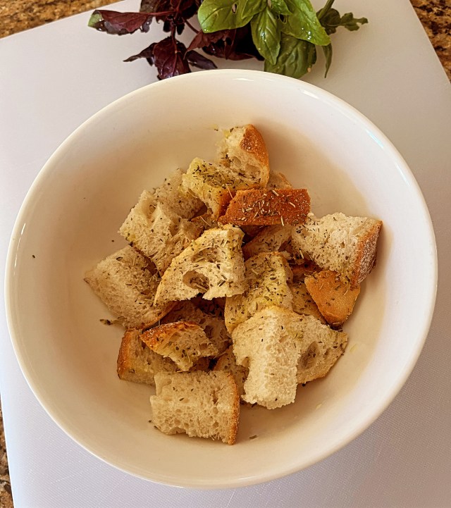 - I like to add dried herbs to the bread which I had baked for a few minutes in the oven to make it crispy. This is my little secret to add more flavour to this salad.