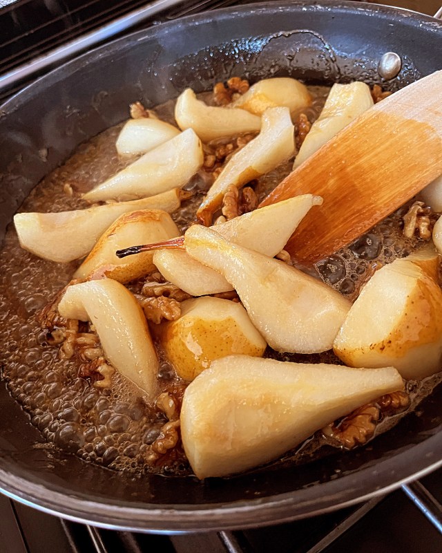 - Add the pears and walnuts and cook for 5 to 7 minutes or until the pears are just soft.