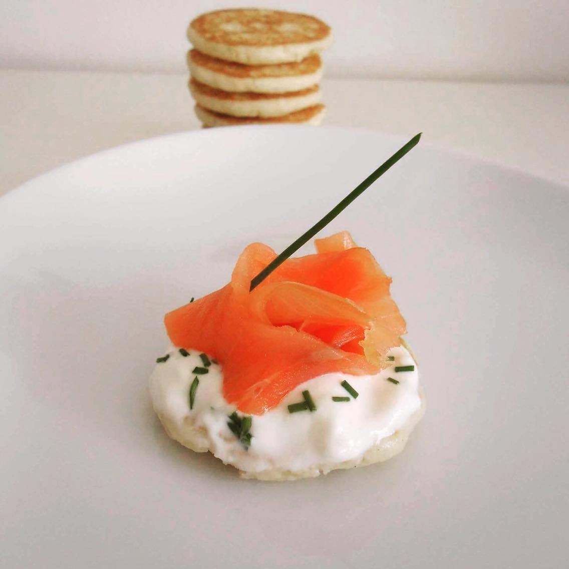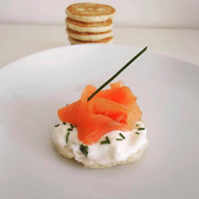 - To serve, top each blini with 1/2 tablespoon of creme fraiche.
