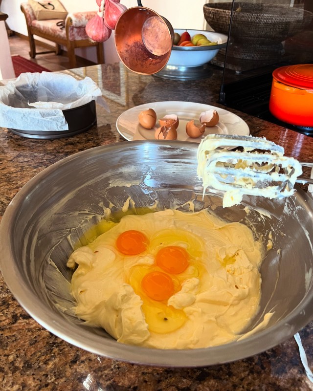 - Then add the eggs, the cream, and the sour cream, mix until it is smooth. I personally like to use a handheld electric beater to do this.