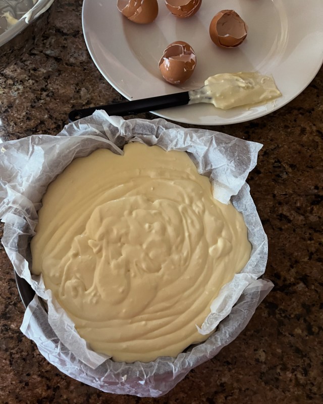 - Pour the mixture into the lined cake tin scrapping out every bit of cheesecake mixture with a spatula.