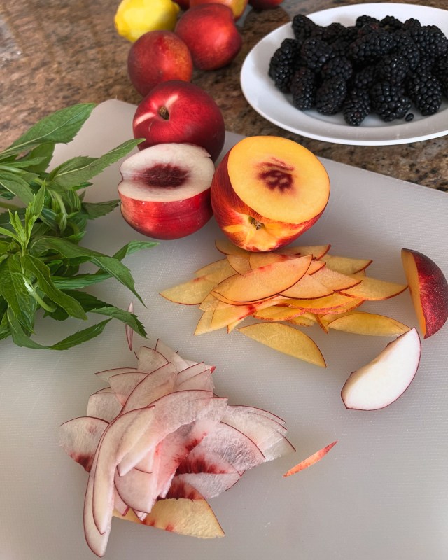 - Slice the nectarines using a mandolin and toss in the lemon juice and sugar.