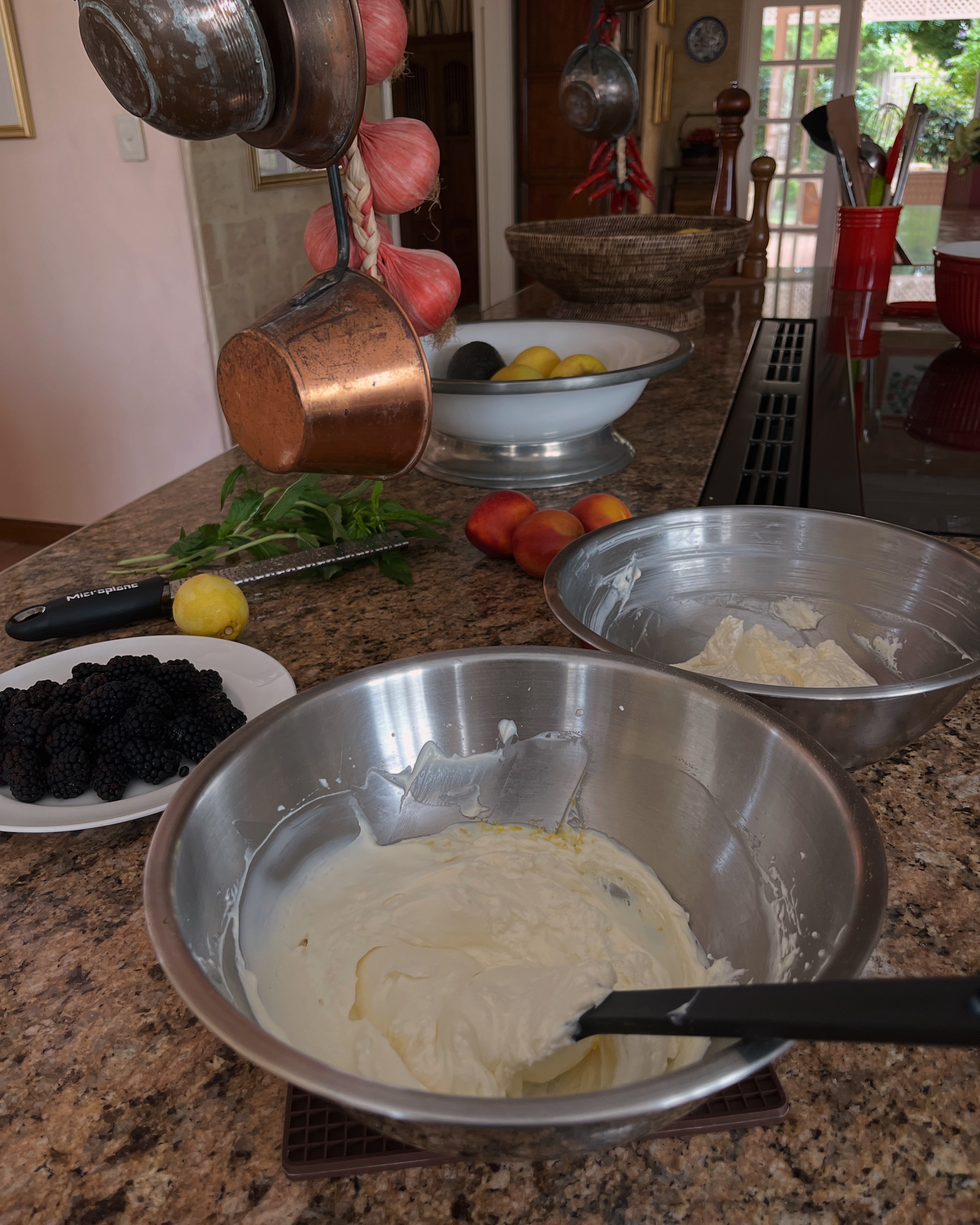 - Add the double cream, the lemon zest and icing sugar. Mix well with a spatula.