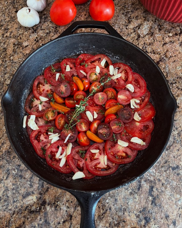 - I am a garlic lover so I always add 2 cloves of garlic sliced thinly sprinkled on top of the tomatoes.