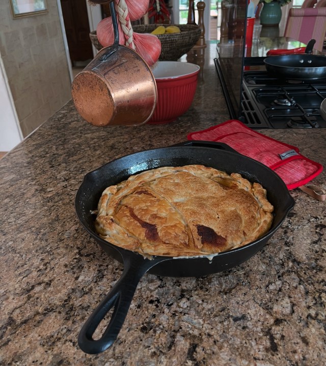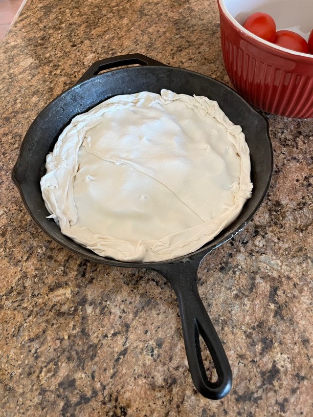- Cut the puff pastry sheet round to fit your ovenproof skillet. Cover until ready to use.