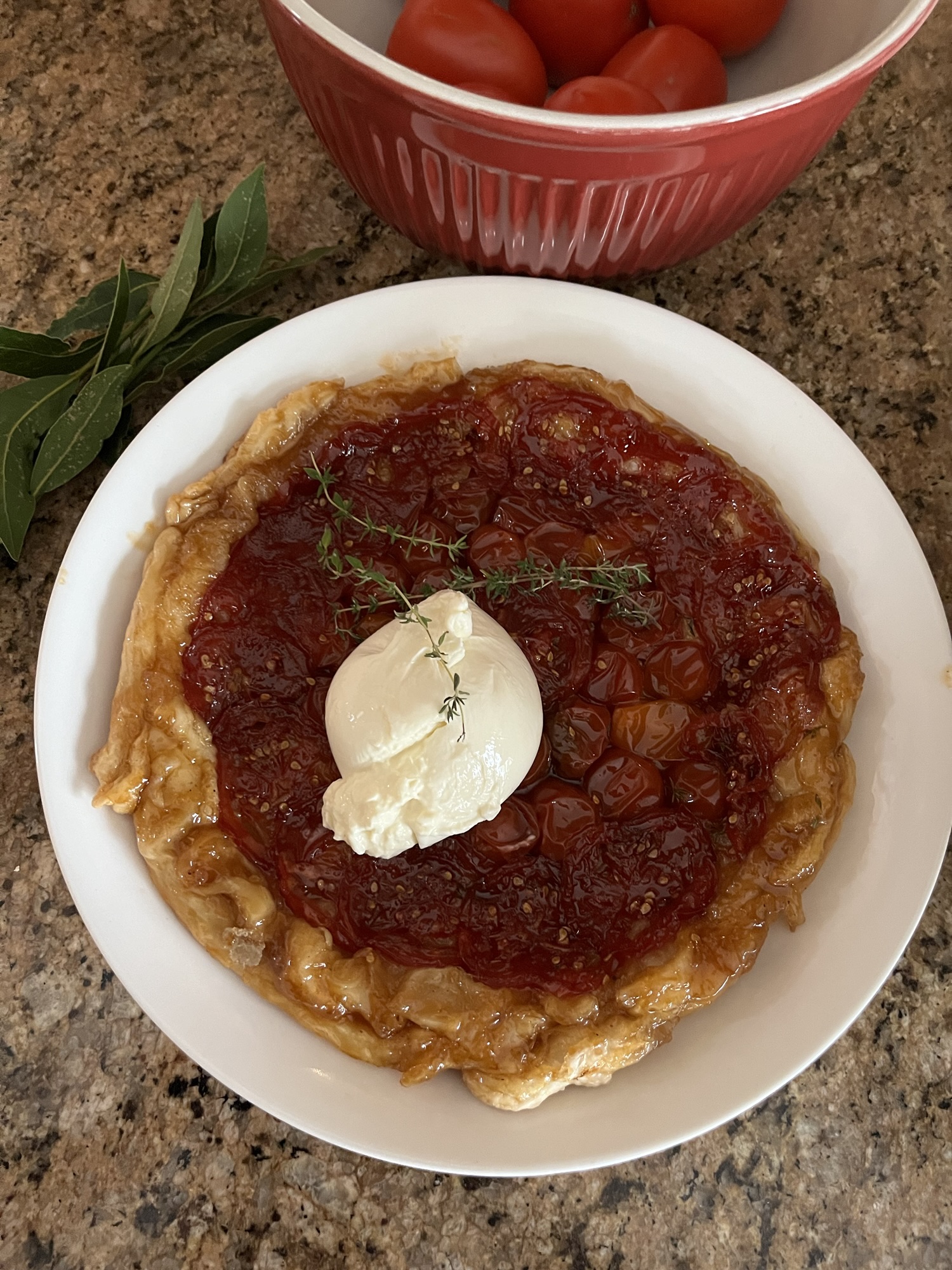 - Scatter the sliced tomatoes. Season with thyme leaves, salt and pepper.