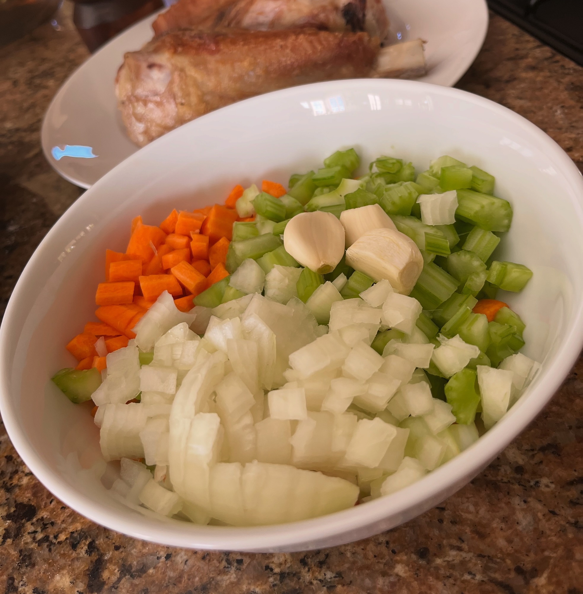 - Heat the remaining oil in the pan. Add the onion, carrots, celery and garlic. Cook stirring until the onion softens.