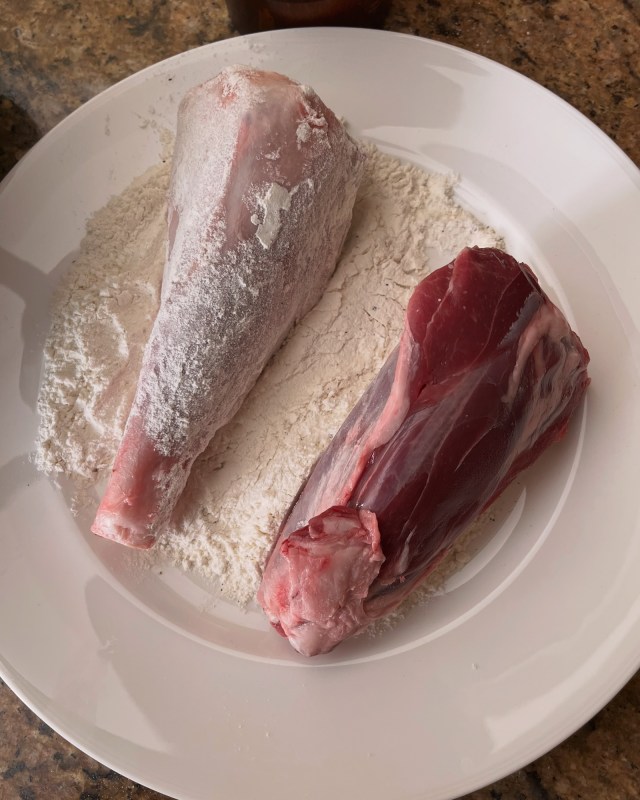 - Dip the lamb shanks in the flour and turn to lightly coat.