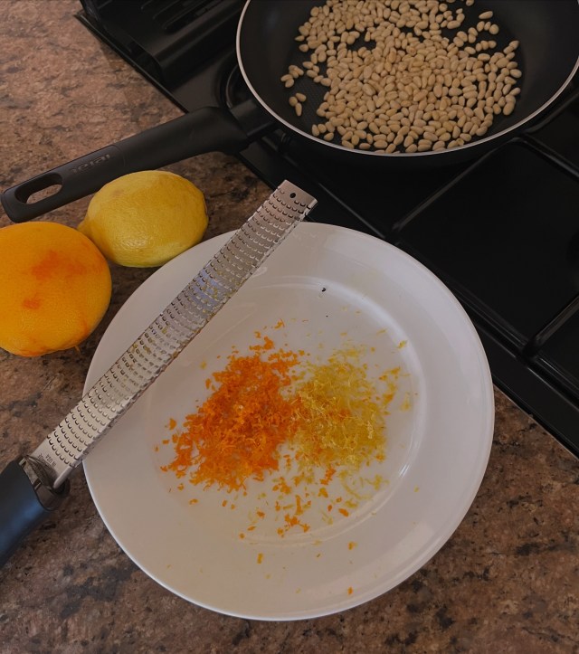 - To make the orange-rosemary gremolata, combine the orange zest, lemon zest, garlic, parsley, pine nuts and rosemary in a small bowl.