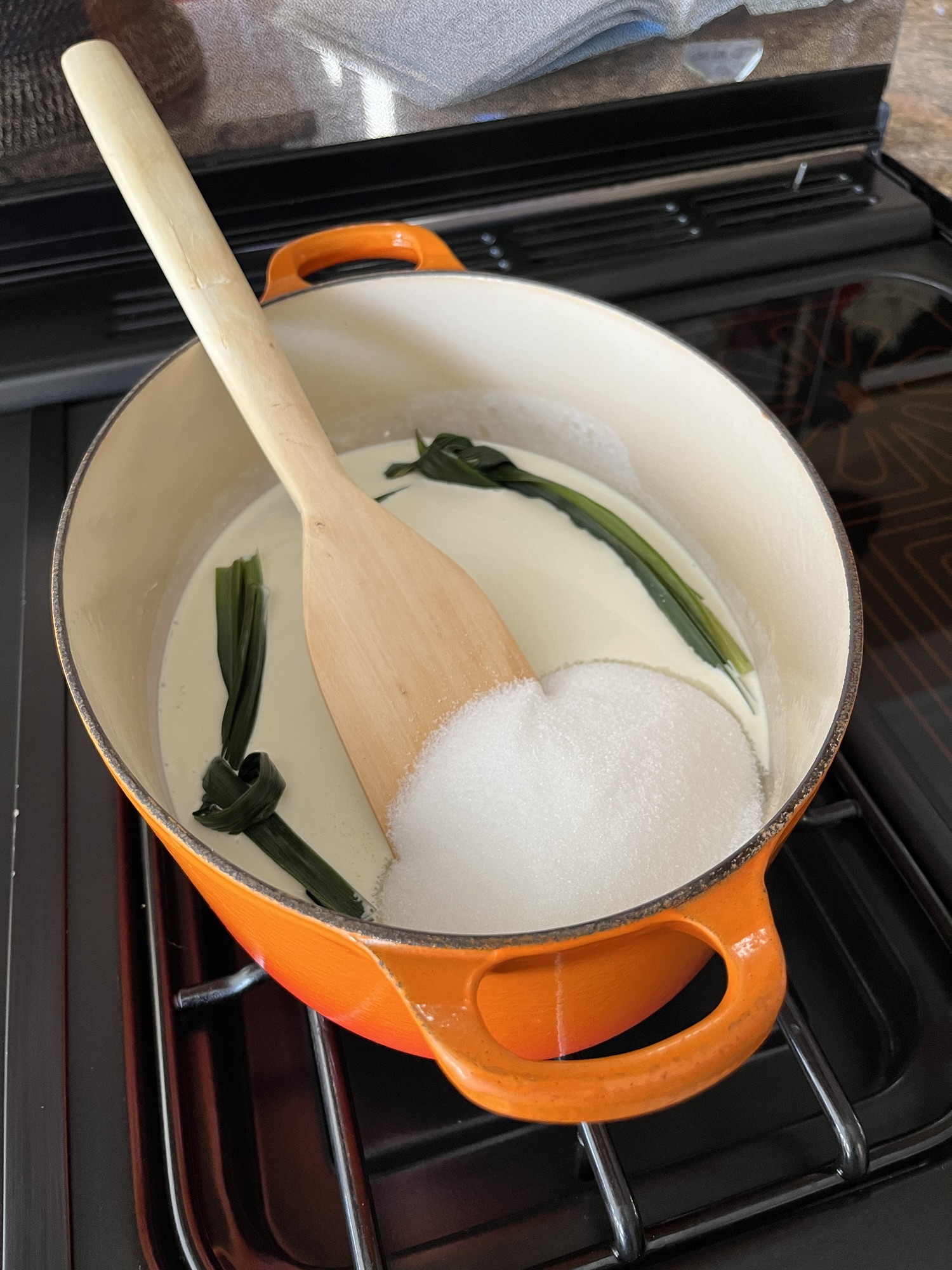 - Place the cream, the Pandan leaves and 200g of caster sugar in a pan and bring just below boiling point over medium-low heat. Stir to dissolve the sugar. Once the sugar has dissolved add the coconut cream. Stir well until all the ingredients are well combined. Set aside for 30 minutes. Remove and discard the pandan leaves.