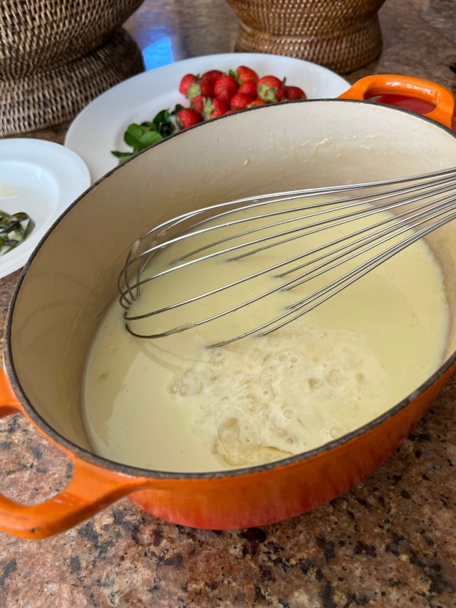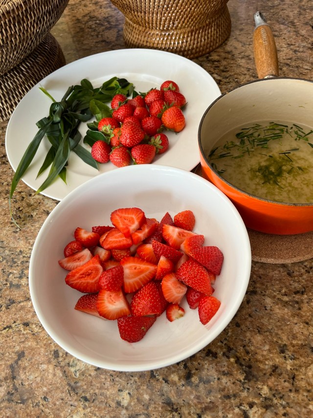 - For the strawberries cut them in halves or quarters, depending on their size. Combine the water and sugar in a pan over low heat. Simmer until the sugar dissolves and then add the lime zest, the juice of two limes and the shredded Kaffir lime leaves.