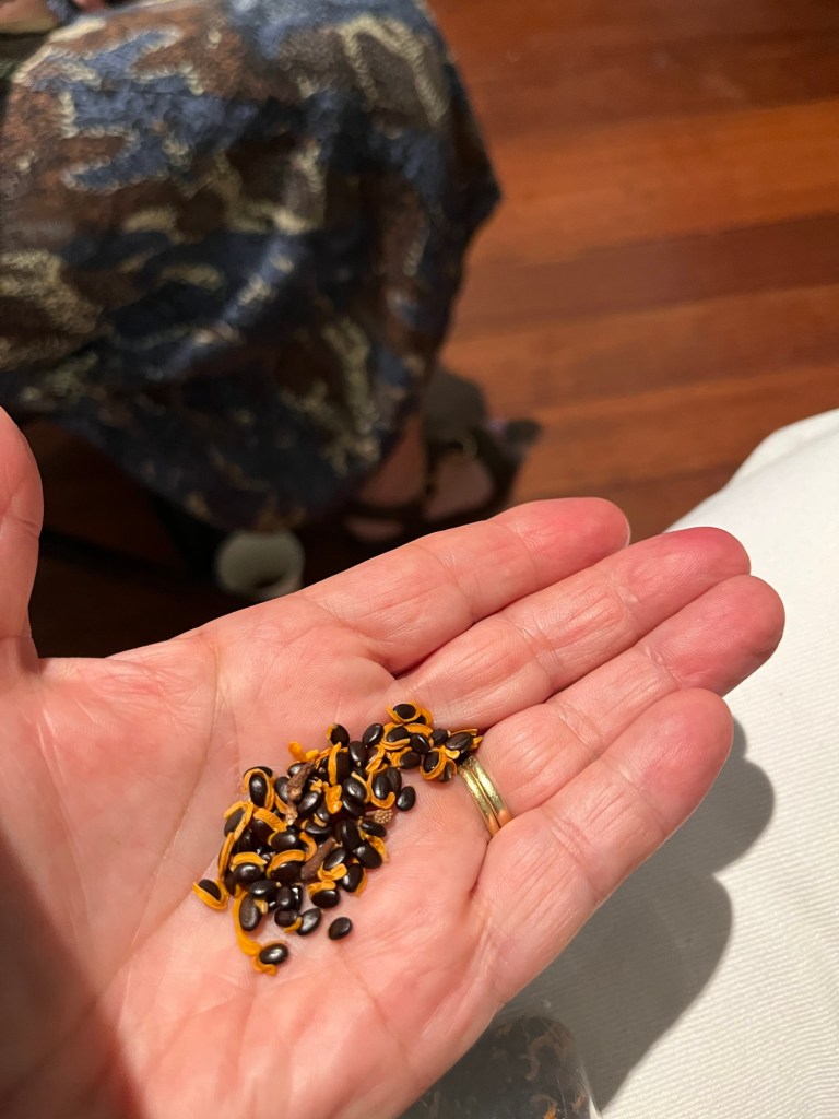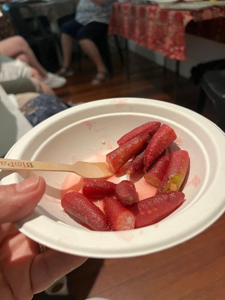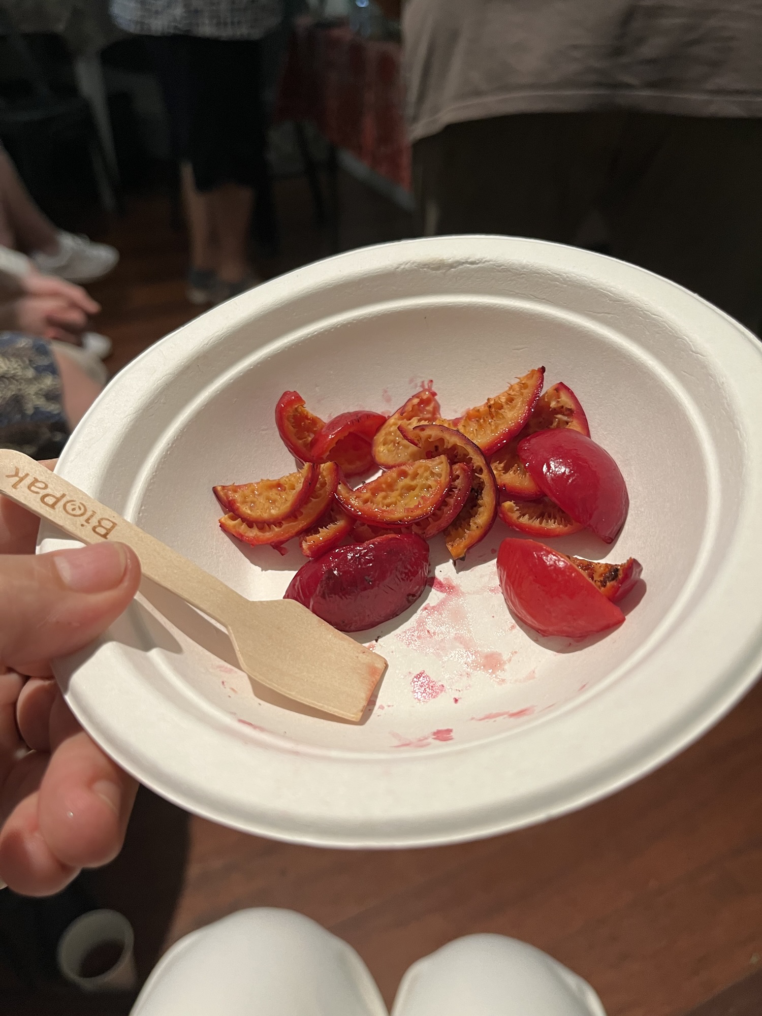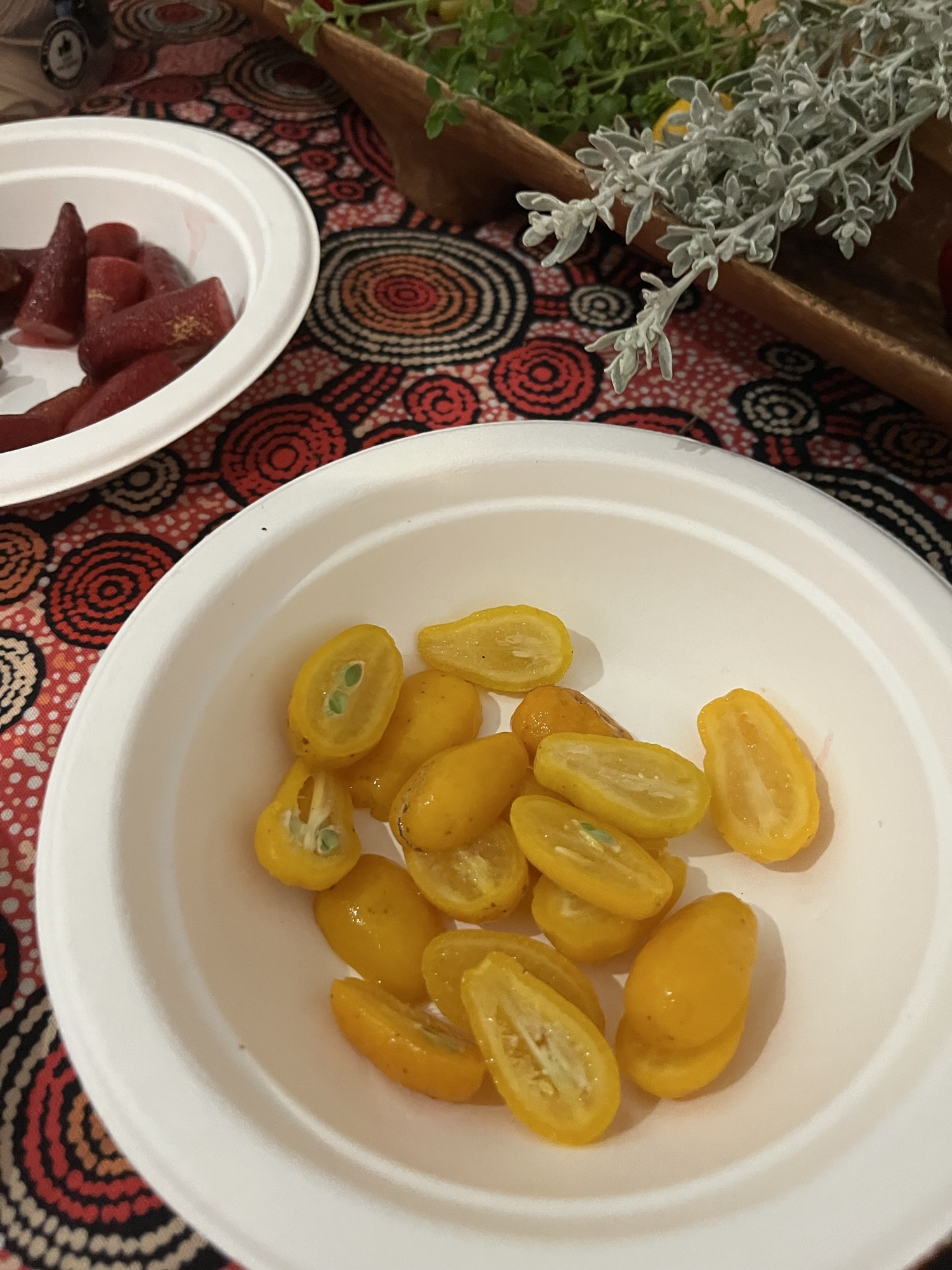 We started the talk with a hot cup of lemon myrtle tea and a swirl of local honey. Dale explores in her talk “the big supermarket that is the Australian bush” These are her own words. Then there was a procession of native fruits, nuts, herbs, spices and peppers. Some were sweet, some were sour, some peppery and some were spicy. The whole journey was a gourmet and colourful experience. She encouraged all of us to incorporate some of these ingredients into everyday cooking.